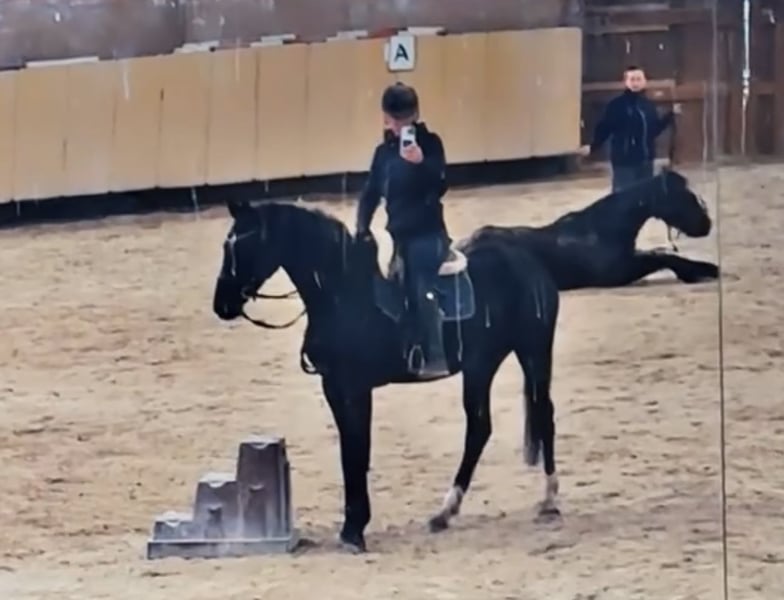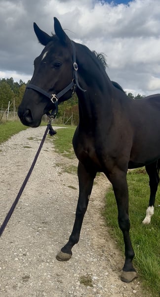 A stunning mare with excellent pedigree and impressive movement quality. Saddle, bridle, side reins, and longeing equipment are, of course, included with her. Since I ride alone, she is still a bit too focused on her surroundings in the arena. Therefore, she will need a little more time to become more relaxed in the arena when I ride her without a handler. The mare approaches you curiously and is friendly in handling.