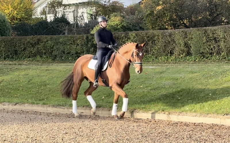 Big Heart of Gold, affectionately called "Goldi" in our stable, is a 6-year-old, already competition-experienced gelding who brings joy to us every day. He has been carefully trained and is truly very easy to ride. He impresses with his excellent quality in all three basic gaits and his exceptionally well-behaved, resilient temperament. He captivates with his presence, outstanding quality, and an excellent work ethic.