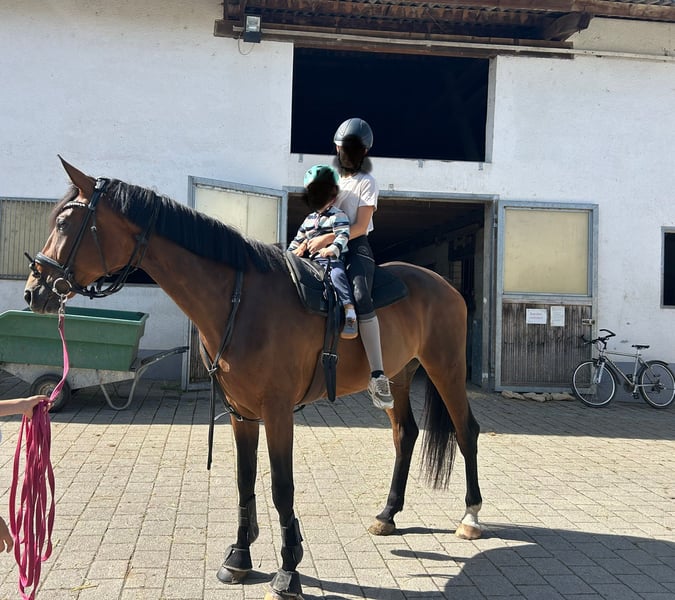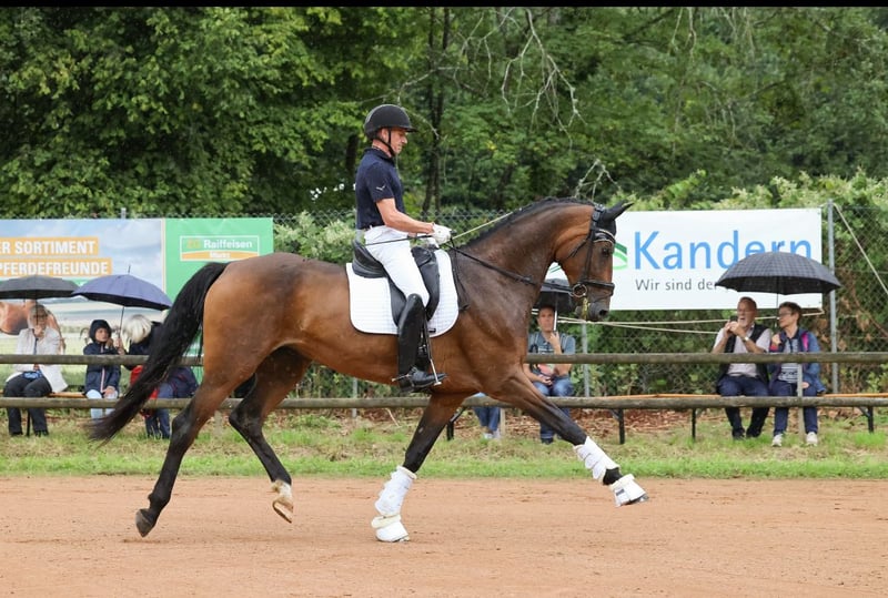 Schweren Herzens - da wir sie nicht alle behalten können, bieten wir unsere 5 jährige Stute Fabienne von Fair Game aus eigener Zucht zum Verkauf in fördernde Hände an. Fabienne wurde aufgrund ihrer Größe erst 4 jährig angeritten und schonend ausgebildet. Dabei fiel schon früh ihr unglaublicher Ehrgeiz und Lernwille auf. Sie verstand die reiterlichen Hilfen sofort und setzte neue Lektionen spielerisch sofort um. So konnte sie sich jetzt in 2025 in ihren ersten Turnierstarts in Dessurpferdeprüfungen der Klasse A immer auf Platz 2-4 platzieren, in ihrer ersten Dressurpferde L am Ende der Saison, holte sie auf Anhieb den 2. Platz in einem starken Starterfeld. Allerdings glänzt sie nicht nur durch ihre Bewegungen, Rittigkeit und Aufnahmegabe, sondern durch ihr starkes Nervenkostüm. Ohne Hängertraining stieg sie von Tag eins an ohne zu zögern in den Hänger. Sie geht alleine und in der Gruppe mit Teenies ins Gelände, ohne je gebockt zu haben oder unkontrolliert zu werden. Sie lässt Kinder auf dem Rücken voltigieren, stört sich nicht an Gänsen, die ihr unter dem Bauch durchlaufen, geht über Brücken wenn der Bach unten durch plätschert und sie juckt es nicht wenn eine Horde Kinder mit dem Bobby Car an ihr vorbei heizen. Sie ist sozial verträglich und geht in der Gruppe auf die Koppel u kommt hierbei mit jedem klar. Auch das Freispringen macht ihr Spaß. Mit dem Reiter geht sie gerne in die Kavaletti Stunde und springt zwischendurch ohne den Sprung anzuschauen einen kleinen Parcours (E-A Höhe). Sie wurde bei uns geboren, ist hier aufgewachsen und war noch nie krank - keine Kolik, angelaufene Beine etc. Röntgenbilder aus dem letzten Jahr der Beine liegen vor - ohne Befund. Zähne wurden gemacht und Zahnstellung u Gebiss einwandfrei. Sie war bis im Frühjahr Barhuf und wurde aufgrund unserer Böden vorne beschlagen. Top Hufqualität u Form. Sie hat an einem Auge einen verengten Tränenkanal. Dadurch hat sie etwas mehr Tränenflüssigkeit als auf dem anderen Auge, dass weder zu Entzündungen, noch zu Einschränkungen hervorruft. Unter dem Reiter ist sie fein und mit dem perfektem Go ausgestattet. Im Umgang ist sie manchmal etwas grobmotorisch unterwegs :) eher das Model Büffel im Porzellanladen wobei sie dabei nie böse ist. Wir glauben sie merkt es gar nicht mal wenn sie jemandem auf dem Fuß steht :) Alles in Allem macht sie unfassbar viel Spaß und ist ein absolutes Verlasspferd. Wir möchten erwähnen dass es kein Notverkauf ist und wir sie nur in ein 5* Zu Hause abgeben. Sie kennt Boxen, Paddockboxen und Offenstallhaltung mit entsprechendem Weidegang.