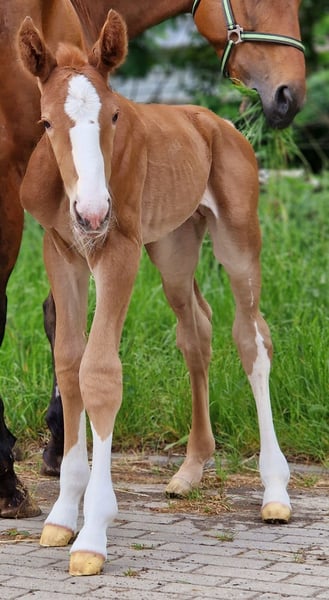 Obladi-Oblada ist ein typvoller bunter Fuchshengst aus dem Jahr 2025 mit einer besonders spannenden springgeprägten Abstammung. Er stammt ab von Ogano Sitte und führt mütterlicherseits das wertvolle Blut von For Pleasure x Don Juan x Wienerwald. Schon heute überzeugt er mit viel Ausdruck, modernem Typ und einer Abstammung, die für Sportlichkeit und Perspektive steht. Als roher Junghengst bietet er seinem künftigen Besitzer alle Möglichkeiten, ihn in Ruhe weiter aufwachsen zu lassen und gezielt für die Zukunft aufzubauen. Wächst im altersgemischten Herdenverband auf. Ein sehr interessanter Nachwuchs für Aufzüchter und Sportreiter, die ein junges Pferd mit attraktivem Pedigree und viel Entwicklungspotential suchen.