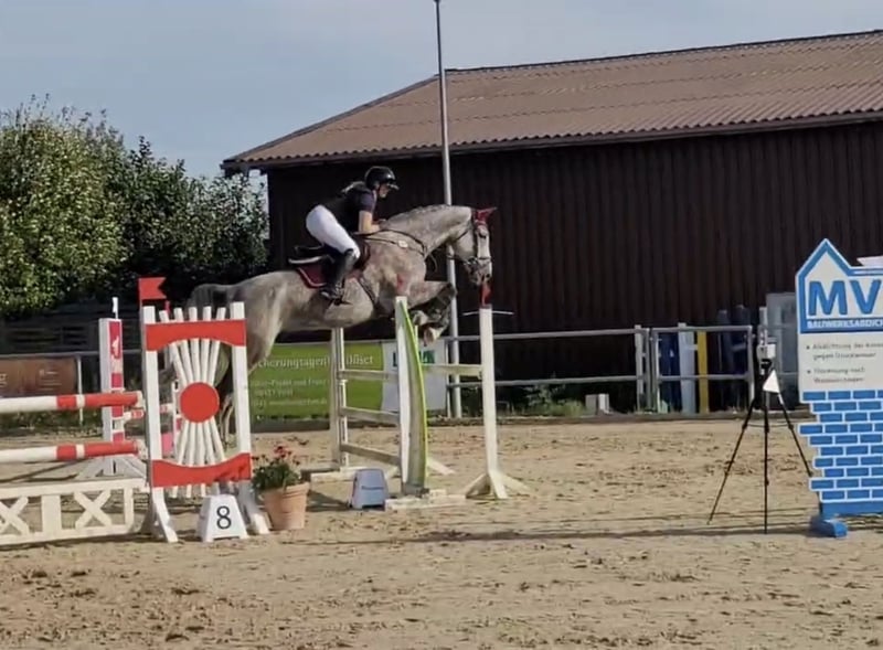 Zum Verkauf steht ein 6-jähriger Zangersheider Wallach, der durch seine Qualität und sein Erscheinungsbild überzeugt. Der elegante Apfelschimmel besticht durch sein sehr freundliches und ausgeglichenes Wesen. Mit einem Stockmaß von 175 cm ist er ideal für ambitionierte Reiter, die Wert auf Qualität und Leistungsbereitschaft legen. Sein Schwerpunkt liegt im Springen, wo er seine Talent unter Beweis stellt. Der Wallach ist gut ausgebildet und zeigt großes Potenzial für den Turnierreitsport. Am Sprung zeigt er sich als sehr zuverlässig und springt aus jeder Lebenslage. Er lief dieses Jahr seine erste Turniersaison und konnte sich direkt mehrfach A platzieren und auch direkt in seinem ersten L-Springen mit einer Note von 7,8. Er hat ebenfalls schon A gewonnen. Bei Interesse oder für weitere Informationen stehe ich ihnen gerne zur Verfügung. Videos können auf Anfrage ebenfalls geschickt werden. Um Reittourismus zu vermeiden, nehmen wir für das Probereiten 20€, was bei einem späteren Kauf selbstverständlich verrechnet wird.