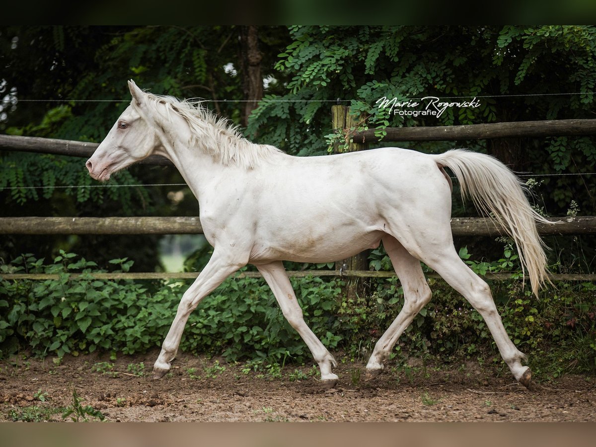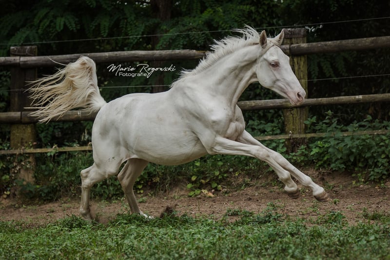 DOUBLE CREAM Z ha heredado lo mejor de sus dos padres cremello, el semental premium DON CREAM GF y WHIPPED CREAM GF. Como un ser de cuento de hadas, flota como un unicornio etéreo hacia el atardecer... o también le gusta ensuciarse, ya que puede vivir al aire libre 24/7/365 con sus compañeros en un grupo de yeguas de diferentes edades. Es la última cría de la icónica criadora de caballos de color Gwendolyn Gregorio y nació con nosotros solo después de su fallecimiento. El resultado de un desarrollo de cría desde 1978 con un plan y objetivo claros. El semental premium DON CREAM GF (última imagen) se destaca por su árbol genealógico artístico (DREAM OF GOLD - MASCARPONE GF), que representa en todos los aspectos. Su descendencia en Inglaterra es impresionante. En nuestra cría, siempre ha producido calidad. WHIPPED CREAM GF (WIN THE GOLD - MALTESER GOLD) ya tiene crías que son yeguas de cría exitosas en Europa, emparejándose con éxito en cualquier disciplina deseada. Es apta para el libro de cría principal de Westfalia, Renania, Oldenburg, DSP y ZSAA sangre noble alemana. El padre materno WIN THE GOLD ha influido en una gran generación alrededor de la cría Falkenhorst y luego se trasladó a Australia, donde continúa enriqueciendo el mundo del caballo de sangre caliente. Nuestro objetivo de cría son caballos de ocio versátiles para el propietario de caballos tradicional, que como buen jinete fomenta y gimnasia a los animales en armonía con su desarrollo según la enseñanza clásica. Los potros crecen en grupos mixtos en grandes praderas al aire libre durante todo el año. El suelo más bien árido fortalece a los jóvenes, que reciben alimentación complementaria adecuada, con acceso libre a heno y paja orgánicos y minerales, adaptados a sus necesidades energéticas. Se desparacitan regularmente (ZSE) y se mantienen los pies en forma con ortopedia equina. La cría se maneja de manera holística y prioritariamente con medicina natural. Tienen contacto diario con nosotros, los humanos, y disfrutan de ello. Ya conocen muchas cosas de la vida cotidiana, incluso en el recorrido de suelo, el round pen o bajo el solárium. Sin embargo, debemos dejarlos ir, solo a las mejores manos. Pasaporte Zangersheide "sección principal" (libro de cría principal) y registro IFCE (Facteur Selle Francais). Todo lo demás en una conversación personal. El animal puede quedarse para su crianza en condiciones muy favorables. El propietario tiene a su disposición nuestras casas móviles en la cría para visitas regulares.
