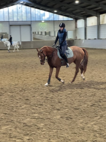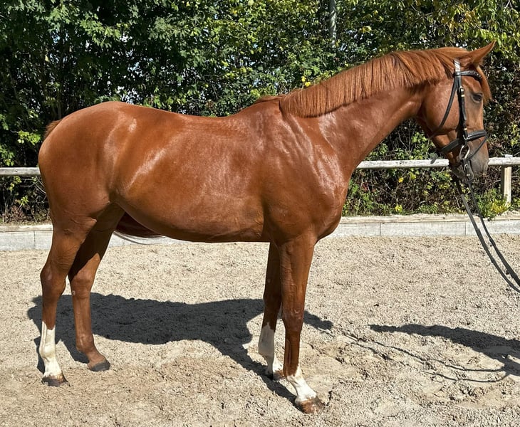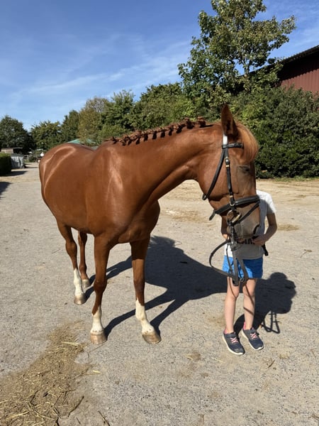 For sale is a stunning chestnut mare, born in 2021, currently measuring 15.8 hh. She comes from a renowned Zangersheide breeding program and impresses with her noble appearance as well as her promising dressage and show jumping qualities. The mare is ideal for ambitious riders, whether for young riders or, for example, for a mother-daughter pair, seeking a reliable partner for dressage or jumping. In her basic training, she is very attentive and eager to learn, with three excellent gaits. She is a true sweetheart in handling! Calm, gentle, and very fond of being pampered. She is familiar with children, dogs, and tractors, and remains completely relaxed in all situations. Due to lack of time, we are looking for a new, loving home where she can continue to develop her full potential. Please feel free to contact me for more information or to arrange a viewing.