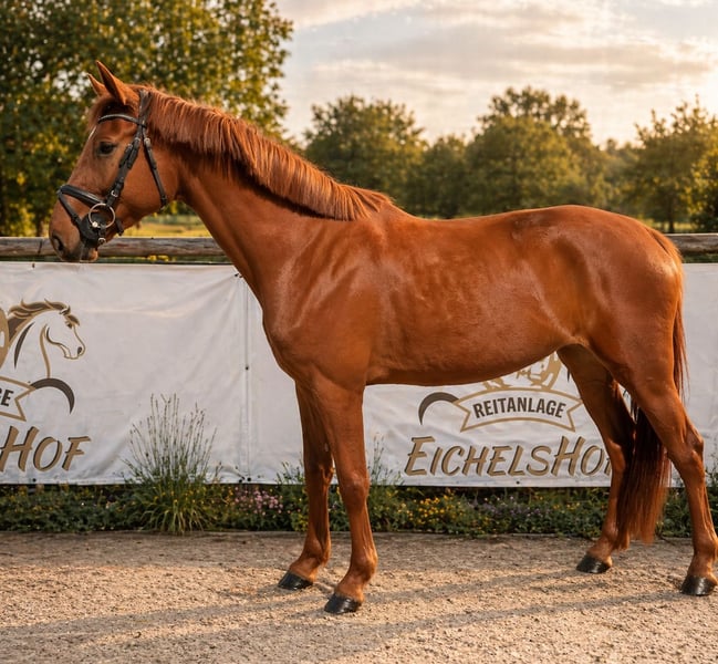 Diese elegante Fuchsstute, geboren im Jahr 2021, überzeugt durch ihre vielversprechende Abstammung und ihre beeindruckende Erscheinung. Mit einem Stockmaß von 170 cm vereint sie Größe und Präsenz, die sie zu einer vielversprechenden Nachwuchshoffnung im Springsport machen. Zur Zeit wird sie schonend angeritten und zeigt sich hierbei sehr lernwillig und ehrgeizig.