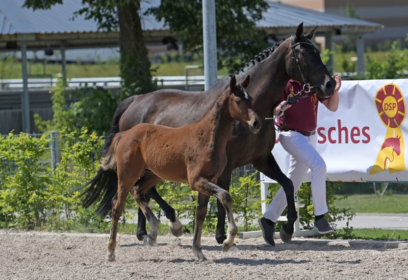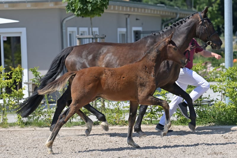This beautiful and very correctly built dressage stallion was born on March 10, 2025. He is an embryo transfer foal from the famous Vitalos. The mother of the foal, Quality Time, is 10 years old this year and is an Oldenburg elite mare - Pedigree: Quantensprung/Placido. Quality Time has been successfully competing in dressage for years and has won all competitions in 2025 so far, achieving scores of 69-70% in M**, S*, and S** classes. She is currently nearly ready for S*** and will make her debut at this level this season. Quality Time was also qualified for the Bundeschampionat as a 5-year-old. With this beautiful and talented stallion foal, you are securing the future! The sale is directly from the breeder. The mother is also with us and can be viewed. !! The mare that the foal is at foot with is not the genetic mother but a surrogate mother. The ridden black mare in the videos/pictures is the genetic mother. Additionally, we are selling a full sister to this foal, born on March 23, 2025.